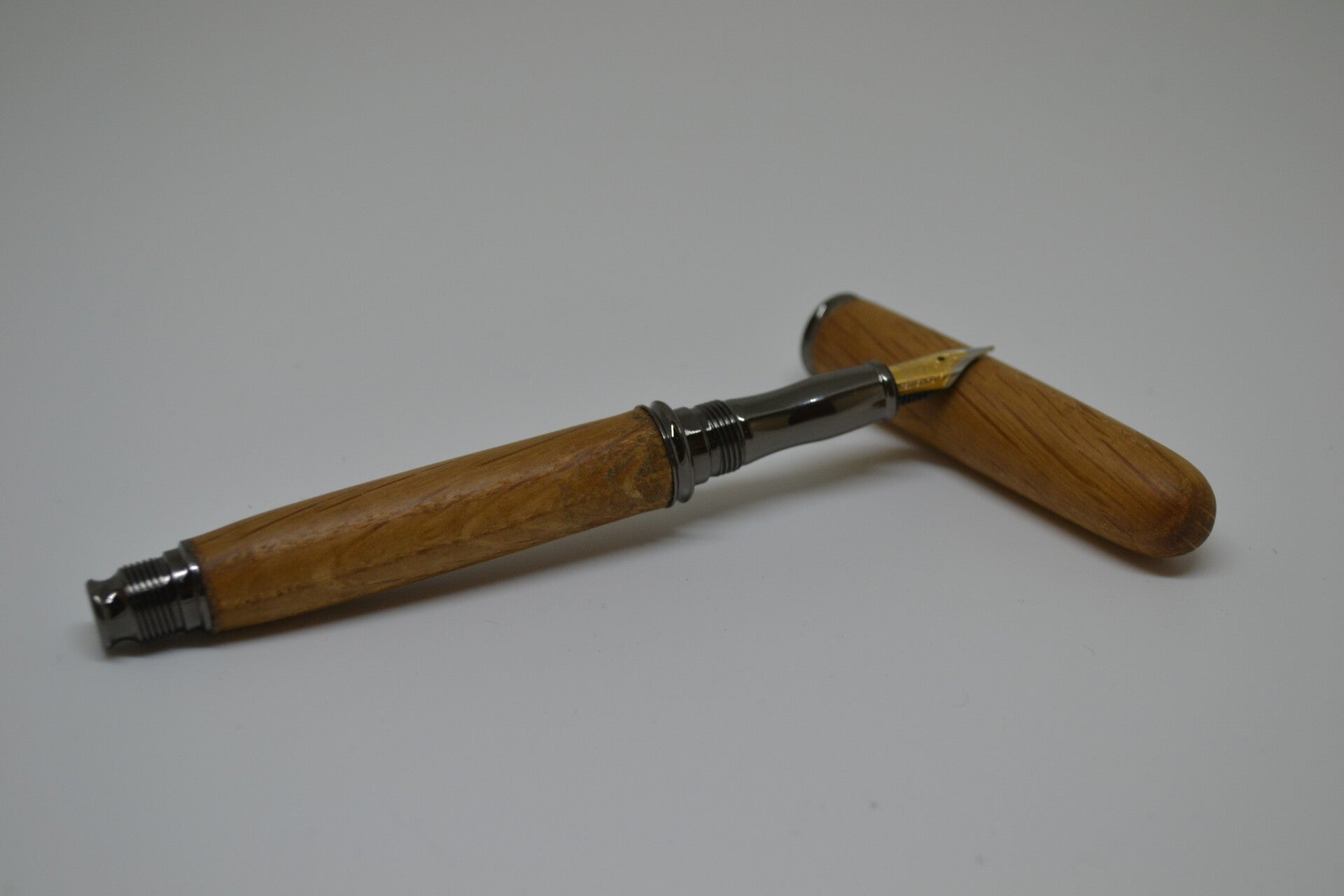 Fountain pen with gun-metal furnishings dressed in Irish Oak. The Oak is from killarney.
