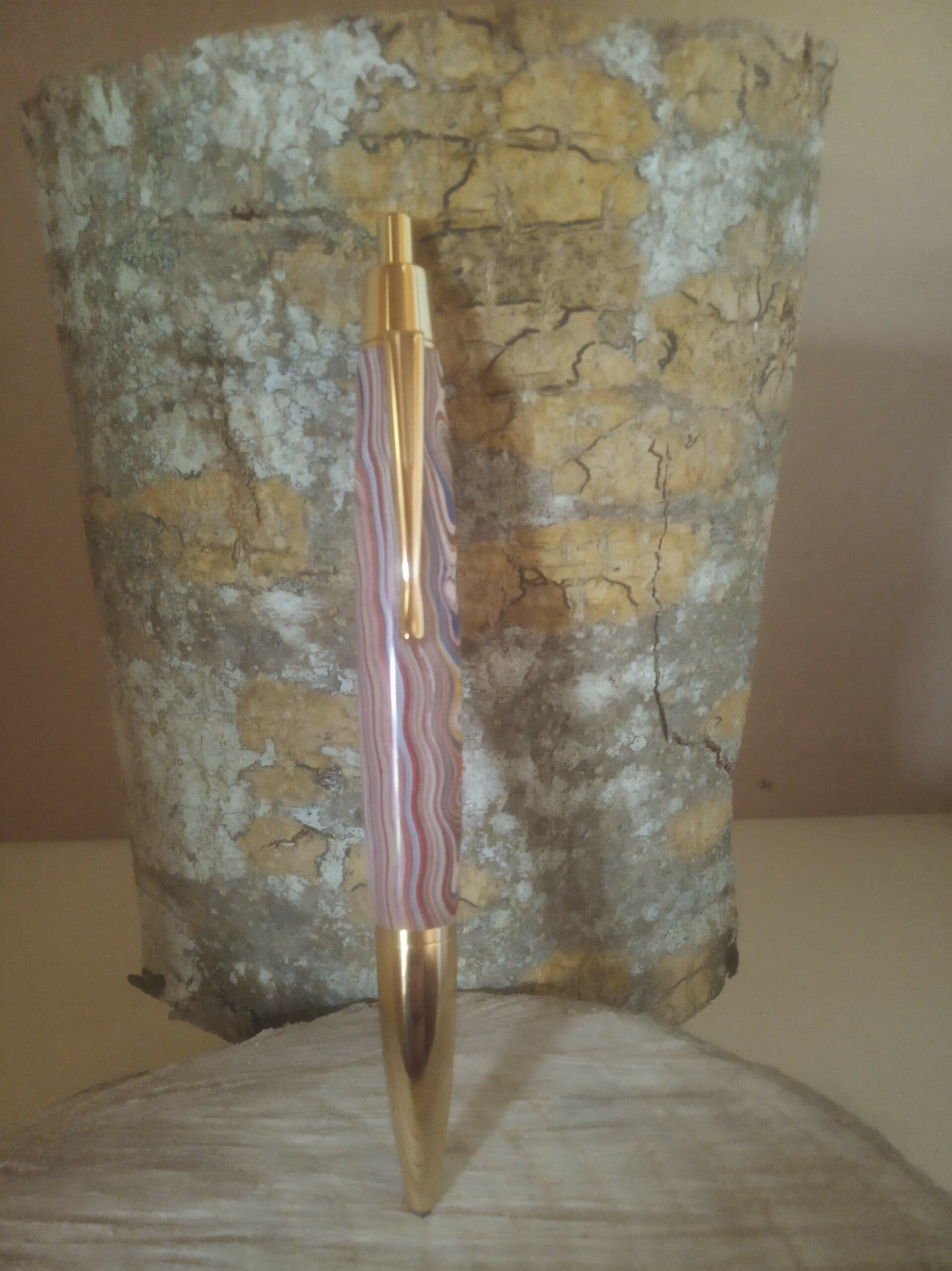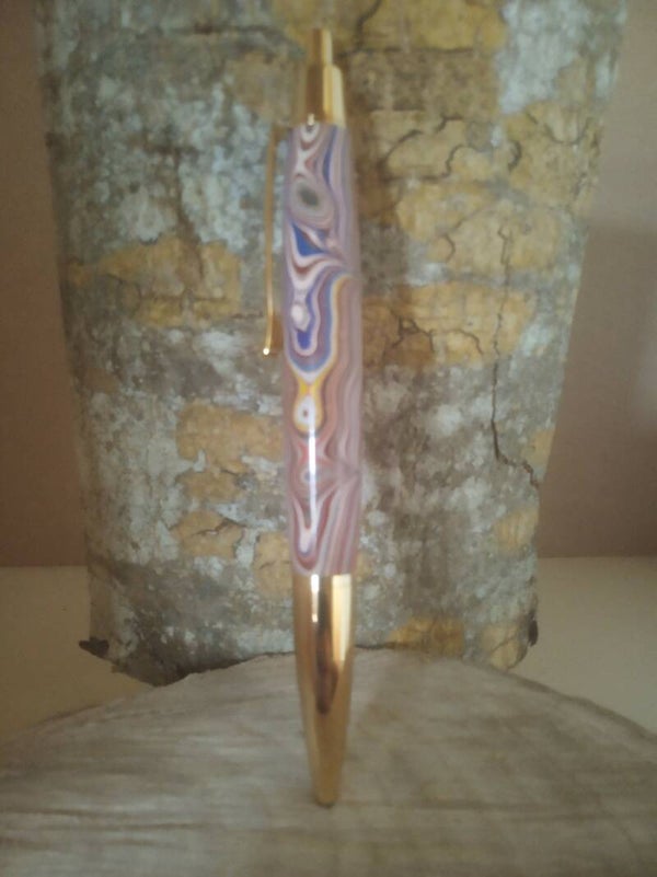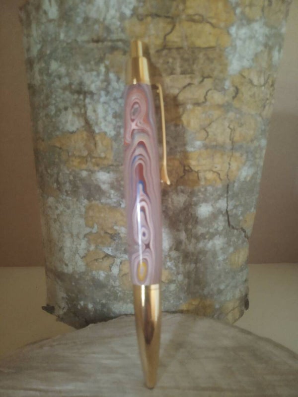 Fabulously colourful Fordite locally sourced from the Liebherr factory in Killarney. Paired with a gold Athena clickpen kit.