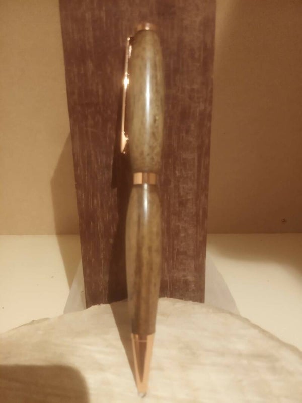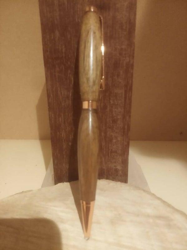 Rose gold slimline twist pen dressed in European Walnut. The wood came from off-cuts from a local cabinet maker.