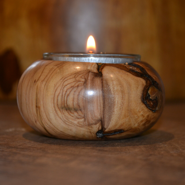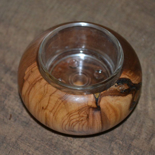 Tea Light holder hand turned from Irish Crabapple wood with a glass insert. 2 3/4 inches diameter by 1 1/2 inches high.