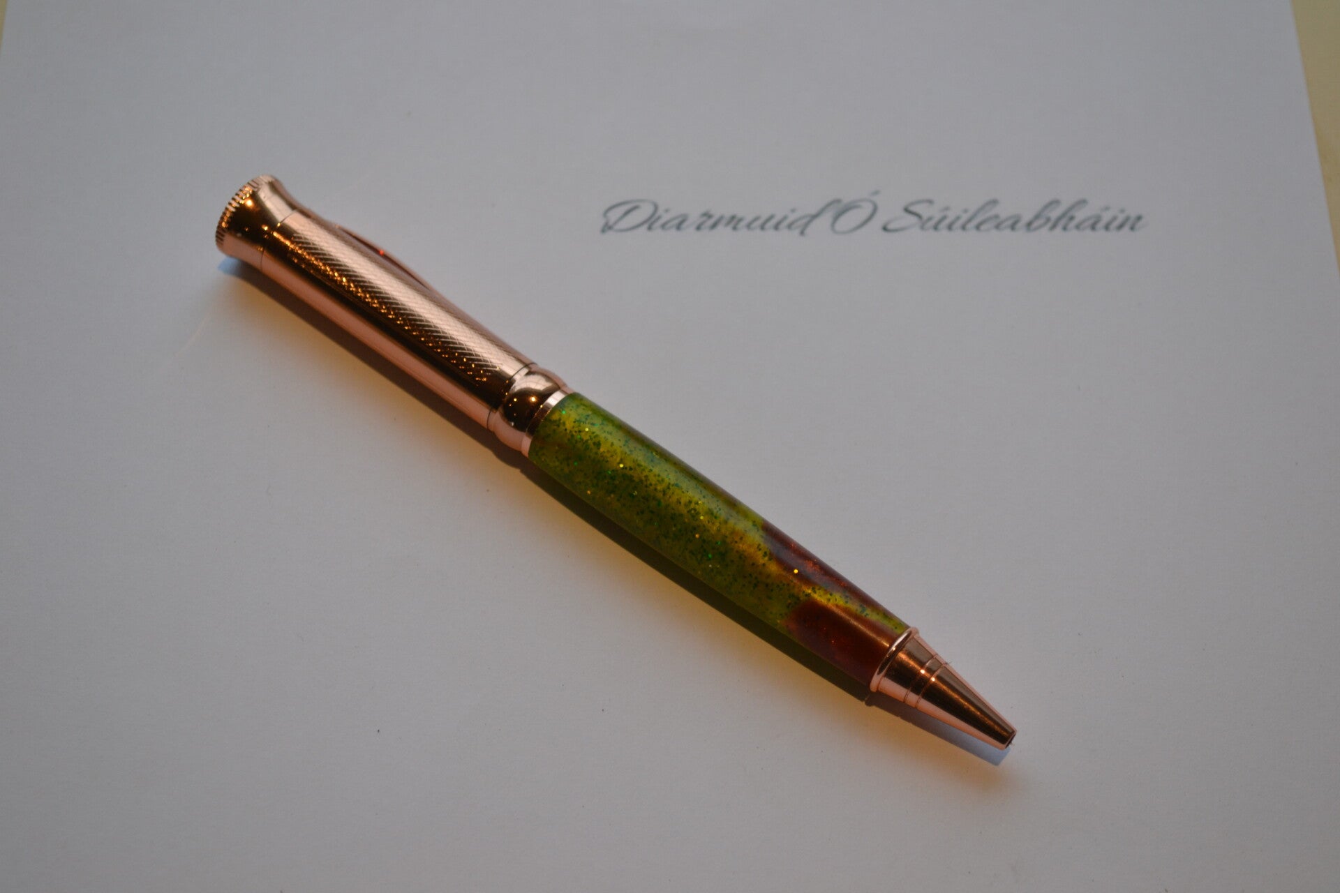 Rose gold twist pen dressed in a green and burgundy glitter resin that looks like an algal bloom. Fitted with a Parker style refill.